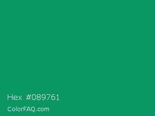 Hex #089761 Color is a normal green color and the nearest color is Green Cyan #009966. Hex code #089761 and RGB value is rgb(8,151,97). In RGB color space, this color is composed of 3% red, 59% green, 38% blue, In CMYK color space, this color is composed of 95% cyan, 0% magenta, 36% yellow , 41% black , In HSL color space, this color has a hue angle of 157° , 90% saturation and 31% lightness.