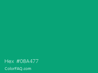 Hex #08a477 Color is a normal green color and the nearest color is Green Munsell #00a877. Hex code #08a477 and RGB value is rgb(8,164,119). In RGB color space, this color is composed of 3% red, 64% green, 47% blue, In CMYK color space, this color is composed of 95% cyan, 0% magenta, 27% yellow , 36% black , In HSL color space, this color has a hue angle of 163° , 91% saturation and 34% lightness.