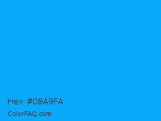 Hex #08a9fa Color is a normal blue color and the nearest color is Vivid Cerulean #00aaee. Hex code #08a9fa and RGB value is rgb(8,169,250). In RGB color space, this color is composed of 3% red, 66% green, 98% blue, In CMYK color space, this color is composed of 97% cyan, 32% magenta, 0% yellow , 2% black , In HSL color space, this color has a hue angle of 200° , 96% saturation and 51% lightness.