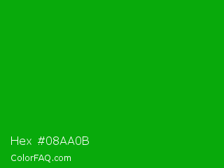 Hex #08aa0b Color is a normal green color and the nearest color is Islamic Green #009000. Hex code #08aa0b and RGB value is rgb(8,170,11). In RGB color space, this color is composed of 3% red, 67% green, 4% blue, In CMYK color space, this color is composed of 95% cyan, 0% magenta, 94% yellow , 33% black , In HSL color space, this color has a hue angle of 121° , 91% saturation and 35% lightness.