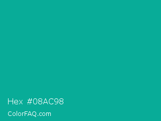 Hex #08ac98 Color is a normal cyan color and the nearest color is Persian Green #00a693. Hex code #08ac98 and RGB value is rgb(8,172,152). In RGB color space, this color is composed of 3% red, 67% green, 60% blue, In CMYK color space, this color is composed of 95% cyan, 0% magenta, 12% yellow , 33% black , In HSL color space, this color has a hue angle of 173° , 91% saturation and 35% lightness.