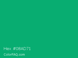 Hex #08ad71 Color is a normal green color and the nearest color is Jade #00a86b. Hex code #08ad71 and RGB value is rgb(8,173,113). In RGB color space, this color is composed of 3% red, 68% green, 44% blue, In CMYK color space, this color is composed of 95% cyan, 0% magenta, 35% yellow , 32% black , In HSL color space, this color has a hue angle of 158° , 91% saturation and 35% lightness.