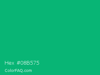 Hex #08b575 Color is a normal green color and the nearest color is Green Munsell #00a877. Hex code #08b575 and RGB value is rgb(8,181,117). In RGB color space, this color is composed of 3% red, 71% green, 46% blue, In CMYK color space, this color is composed of 96% cyan, 0% magenta, 35% yellow , 29% black , In HSL color space, this color has a hue angle of 158° , 92% saturation and 37% lightness.