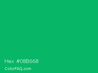 Hex #08b668 Color is a normal green color and the nearest color is GO Green #00ab66. Hex code #08b668 and RGB value is rgb(8,182,104). In RGB color space, this color is composed of 3% red, 71% green, 41% blue, In CMYK color space, this color is composed of 96% cyan, 0% magenta, 43% yellow , 29% black , In HSL color space, this color has a hue angle of 153° , 92% saturation and 37% lightness.