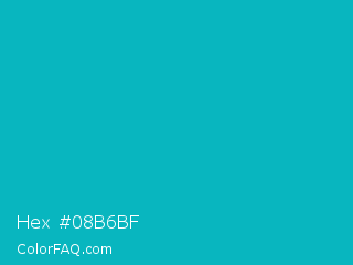 Hex #08b6bf Color is a normal cyan color and the nearest color is Tiffany Blue #0abab5. Hex code #08b6bf and RGB value is rgb(8,182,191). In RGB color space, this color is composed of 3% red, 71% green, 75% blue, In CMYK color space, this color is composed of 96% cyan, 5% magenta, 0% yellow , 25% black , In HSL color space, this color has a hue angle of 183° , 92% saturation and 39% lightness.