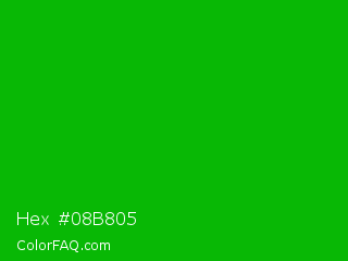 Hex #08b805 Color is a normal green color and the nearest color is Islamic Green #009000. Hex code #08b805 and RGB value is rgb(8,184,5). In RGB color space, this color is composed of 3% red, 72% green, 2% blue, In CMYK color space, this color is composed of 96% cyan, 0% magenta, 97% yellow , 28% black , In HSL color space, this color has a hue angle of 119° , 95% saturation and 37% lightness.