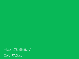 Hex #08b857 Color is a normal green color and the nearest color is GO Green #00ab66. Hex code #08b857 and RGB value is rgb(8,184,87). In RGB color space, this color is composed of 3% red, 72% green, 34% blue, In CMYK color space, this color is composed of 96% cyan, 0% magenta, 53% yellow , 28% black , In HSL color space, this color has a hue angle of 147° , 92% saturation and 38% lightness.