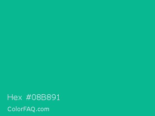 Hex #08b891 Color is a normal cyan color and the nearest color is Persian Green #00a693. Hex code #08b891 and RGB value is rgb(8,184,145). In RGB color space, this color is composed of 3% red, 72% green, 57% blue, In CMYK color space, this color is composed of 96% cyan, 0% magenta, 21% yellow , 28% black , In HSL color space, this color has a hue angle of 167° , 92% saturation and 38% lightness.
