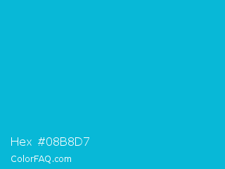 Hex #08b8d7 Color is a normal cyan color and the nearest color is Turquoise Surf #00c5cd. Hex code #08b8d7 and RGB value is rgb(8,184,215). In RGB color space, this color is composed of 3% red, 72% green, 84% blue, In CMYK color space, this color is composed of 96% cyan, 14% magenta, 0% yellow , 16% black , In HSL color space, this color has a hue angle of 189° , 93% saturation and 44% lightness.