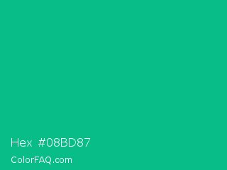 Hex #08bd87 Color is a normal green color and the nearest color is Mountain Meadow Crayola #1ab385. Hex code #08bd87 and RGB value is rgb(8,189,135). In RGB color space, this color is composed of 3% red, 74% green, 53% blue, In CMYK color space, this color is composed of 96% cyan, 0% magenta, 29% yellow , 26% black , In HSL color space, this color has a hue angle of 162° , 92% saturation and 39% lightness.