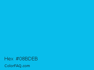 Hex #08bdeb Color is a normal cyan color and the nearest color is Cyan Process #00b7eb. Hex code #08bdeb and RGB value is rgb(8,189,235). In RGB color space, this color is composed of 3% red, 74% green, 92% blue, In CMYK color space, this color is composed of 97% cyan, 20% magenta, 0% yellow , 8% black , In HSL color space, this color has a hue angle of 192° , 93% saturation and 48% lightness.
