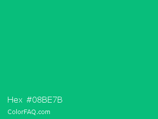 Hex #08be7b Color is a normal green color and the nearest color is Mountain Meadow Crayola #1ab385. Hex code #08be7b and RGB value is rgb(8,190,123). In RGB color space, this color is composed of 3% red, 75% green, 48% blue, In CMYK color space, this color is composed of 96% cyan, 0% magenta, 35% yellow , 25% black , In HSL color space, this color has a hue angle of 158° , 92% saturation and 39% lightness.