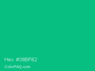 Hex #08bf82 Color is a normal green color and the nearest color is Mountain Meadow Crayola #1ab385. Hex code #08bf82 and RGB value is rgb(8,191,130). In RGB color space, this color is composed of 3% red, 75% green, 51% blue, In CMYK color space, this color is composed of 96% cyan, 0% magenta, 32% yellow , 25% black , In HSL color space, this color has a hue angle of 160° , 92% saturation and 39% lightness.