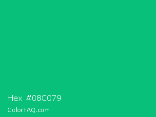 Hex #08c079 Color is a normal green color and the nearest color is Mountain Meadow Crayola #1ab385. Hex code #08c079 and RGB value is rgb(8,192,121). In RGB color space, this color is composed of 3% red, 75% green, 47% blue, In CMYK color space, this color is composed of 96% cyan, 0% magenta, 37% yellow , 25% black , In HSL color space, this color has a hue angle of 157° , 92% saturation and 39% lightness.
