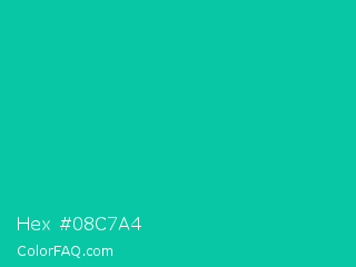 Hex #08c7a4 Color is a normal cyan color and the nearest color is Caribbean Green #00cc99. Hex code #08c7a4 and RGB value is rgb(8,199,164). In RGB color space, this color is composed of 3% red, 78% green, 64% blue, In CMYK color space, this color is composed of 96% cyan, 0% magenta, 18% yellow , 22% black , In HSL color space, this color has a hue angle of 169° , 92% saturation and 41% lightness.