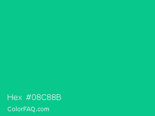 Hex #08c88b Color is a normal green color and the nearest color is Caribbean Green #00cc99. Hex code #08c88b and RGB value is rgb(8,200,139). In RGB color space, this color is composed of 3% red, 78% green, 55% blue, In CMYK color space, this color is composed of 96% cyan, 0% magenta, 31% yellow , 22% black , In HSL color space, this color has a hue angle of 161° , 92% saturation and 41% lightness.