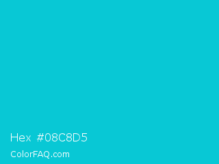 Hex #08c8d5 Color is a normal cyan color and the nearest color is Dark Turquoise #00ced1. Hex code #08c8d5 and RGB value is rgb(8,200,213). In RGB color space, this color is composed of 3% red, 78% green, 84% blue, In CMYK color space, this color is composed of 96% cyan, 6% magenta, 0% yellow , 16% black , In HSL color space, this color has a hue angle of 184° , 93% saturation and 43% lightness.