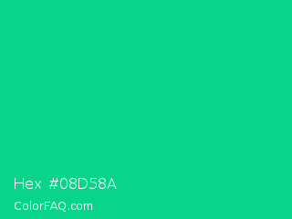 Hex #08d58a Color is a normal green color and the nearest color is Caribbean Green #00cc99. Hex code #08d58a and RGB value is rgb(8,213,138). In RGB color space, this color is composed of 3% red, 84% green, 54% blue, In CMYK color space, this color is composed of 96% cyan, 0% magenta, 35% yellow , 16% black , In HSL color space, this color has a hue angle of 158° , 93% saturation and 43% lightness.