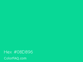 Hex #08d896 Color is a normal green color and the nearest color is Caribbean Green #00cc99. Hex code #08d896 and RGB value is rgb(8,216,150). In RGB color space, this color is composed of 3% red, 85% green, 59% blue, In CMYK color space, this color is composed of 96% cyan, 0% magenta, 31% yellow , 15% black , In HSL color space, this color has a hue angle of 161° , 93% saturation and 44% lightness.