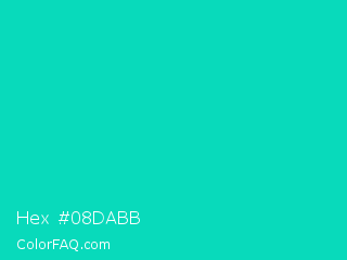 Hex #08dabb Color is a normal cyan color and the nearest color is Robins Egg Blue #00cccc. Hex code #08dabb and RGB value is rgb(8,218,187). In RGB color space, this color is composed of 3% red, 85% green, 73% blue, In CMYK color space, this color is composed of 96% cyan, 0% magenta, 14% yellow , 15% black , In HSL color space, this color has a hue angle of 171° , 93% saturation and 44% lightness.