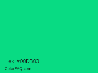 Hex #08db83 Color is a normal green color and the nearest color is Caribbean Green #00cc99. Hex code #08db83 and RGB value is rgb(8,219,131). In RGB color space, this color is composed of 3% red, 86% green, 51% blue, In CMYK color space, this color is composed of 96% cyan, 0% magenta, 40% yellow , 14% black , In HSL color space, this color has a hue angle of 155° , 93% saturation and 45% lightness.