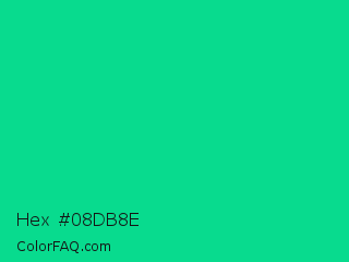Hex #08db8e Color is a normal green color and the nearest color is Caribbean Green #00cc99. Hex code #08db8e and RGB value is rgb(8,219,142). In RGB color space, this color is composed of 3% red, 86% green, 56% blue, In CMYK color space, this color is composed of 96% cyan, 0% magenta, 35% yellow , 14% black , In HSL color space, this color has a hue angle of 158° , 93% saturation and 45% lightness.