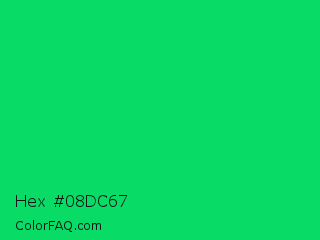 Hex #08dc67 Color is a normal green color and the nearest color is Malachite #0bda51. Hex code #08dc67 and RGB value is rgb(8,220,103). In RGB color space, this color is composed of 3% red, 86% green, 40% blue, In CMYK color space, this color is composed of 96% cyan, 0% magenta, 53% yellow , 14% black , In HSL color space, this color has a hue angle of 147° , 93% saturation and 45% lightness.
