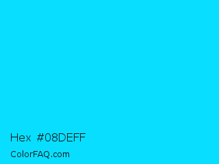 Hex #08deff Color is a normal cyan color and the nearest color is Vivid Sky Blue #00ccff. Hex code #08deff and RGB value is rgb(8,222,255). In RGB color space, this color is composed of 3% red, 87% green, 100% blue, In CMYK color space, this color is composed of 97% cyan, 13% magenta, 0% yellow , 0% black , In HSL color space, this color has a hue angle of 188° , 100% saturation and 52% lightness.