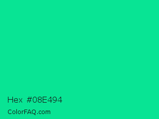 Hex #08e494 Color is a normal green color and the nearest color is Medium Spring Green #00fa9a. Hex code #08e494 and RGB value is rgb(8,228,148). In RGB color space, this color is composed of 3% red, 89% green, 58% blue, In CMYK color space, this color is composed of 96% cyan, 0% magenta, 35% yellow , 11% black , In HSL color space, this color has a hue angle of 158° , 93% saturation and 46% lightness.