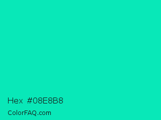 Hex #08e8b8 Color is a normal cyan color and the nearest color is Robins Egg Blue #00cccc. Hex code #08e8b8 and RGB value is rgb(8,232,184). In RGB color space, this color is composed of 3% red, 91% green, 72% blue, In CMYK color space, this color is composed of 97% cyan, 0% magenta, 21% yellow , 9% black , In HSL color space, this color has a hue angle of 167° , 93% saturation and 47% lightness.