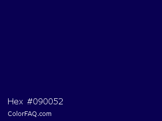Hex #090052 Color is a very dark indigo color and the nearest color is Stratos #000741. Hex code #090052 and RGB value is rgb(9,0,82). In RGB color space, this color is composed of 4% red, 0% green, 32% blue, In CMYK color space, this color is composed of 89% cyan, 100% magenta, 0% yellow , 68% black , In HSL color space, this color has a hue angle of 247° , 100% saturation and 16% lightness.