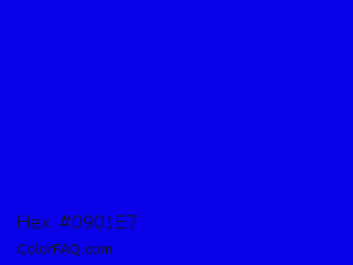 Hex #0901e7 Color is a normal indigo color and the nearest color is Blue #0000ff. Hex code #0901e7 and RGB value is rgb(9,1,231). In RGB color space, this color is composed of 4% red, 0% green, 91% blue, In CMYK color space, this color is composed of 96% cyan, 100% magenta, 0% yellow , 9% black , In HSL color space, this color has a hue angle of 242° , 99% saturation and 45% lightness.