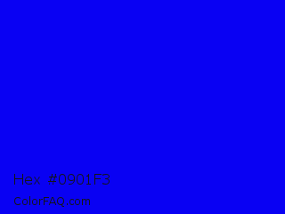 Hex #0901f3 Color is a normal indigo color and the nearest color is Blue #0000ff. Hex code #0901f3 and RGB value is rgb(9,1,243). In RGB color space, this color is composed of 4% red, 0% green, 95% blue, In CMYK color space, this color is composed of 96% cyan, 100% magenta, 0% yellow , 5% black , In HSL color space, this color has a hue angle of 242° , 99% saturation and 48% lightness.