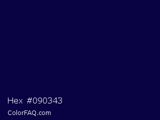 Hex #090343 Color is a very dark indigo color and the nearest color is Stratos #000741. Hex code #090343 and RGB value is rgb(9,3,67). In RGB color space, this color is composed of 4% red, 1% green, 26% blue, In CMYK color space, this color is composed of 87% cyan, 96% magenta, 0% yellow , 74% black , In HSL color space, this color has a hue angle of 246° , 91% saturation and 14% lightness.