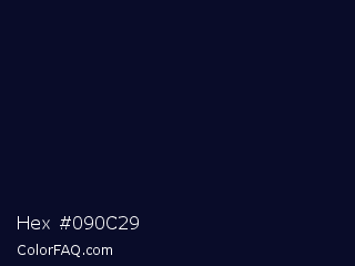 Hex #090c29 Color is a very dark blue color and the nearest color is Black Pearl #041322. Hex code #090c29 and RGB value is rgb(9,12,41). In RGB color space, this color is composed of 4% red, 5% green, 16% blue, In CMYK color space, this color is composed of 78% cyan, 71% magenta, 0% yellow , 84% black , In HSL color space, this color has a hue angle of 234° , 64% saturation and 10% lightness.