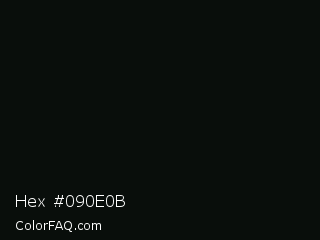 Hex #090e0b Color is a almost black green color and the nearest color is Cod Gray #0b0b0b. Hex code #090e0b and RGB value is rgb(9,14,11). In RGB color space, this color is composed of 4% red, 5% green, 4% blue, In CMYK color space, this color is composed of 36% cyan, 0% magenta, 21% yellow , 95% black , In HSL color space, this color has a hue angle of 144° , 22% saturation and 5% lightness.