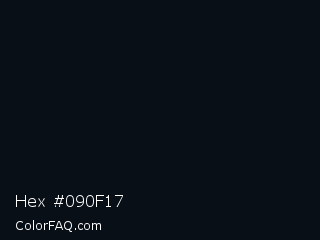 Hex #090f17 Color is a almost black blue color and the nearest color is Bunker #0d1117. Hex code #090f17 and RGB value is rgb(9,15,23). In RGB color space, this color is composed of 4% red, 6% green, 9% blue, In CMYK color space, this color is composed of 61% cyan, 35% magenta, 0% yellow , 91% black , In HSL color space, this color has a hue angle of 214° , 44% saturation and 6% lightness.