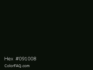 Hex #091008 Color is a almost black green color and the nearest color is Marshland #0b0f08. Hex code #091008 and RGB value is rgb(9,16,8). In RGB color space, this color is composed of 4% red, 6% green, 3% blue, In CMYK color space, this color is composed of 44% cyan, 0% magenta, 50% yellow , 94% black , In HSL color space, this color has a hue angle of 113° , 33% saturation and 5% lightness.