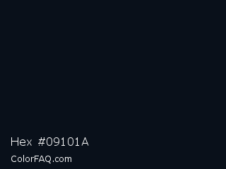 Hex #09101a Color is a almost black blue color and the nearest color is Bunker #0d1117. Hex code #09101a and RGB value is rgb(9,16,26). In RGB color space, this color is composed of 4% red, 6% green, 10% blue, In CMYK color space, this color is composed of 65% cyan, 38% magenta, 0% yellow , 90% black , In HSL color space, this color has a hue angle of 215° , 49% saturation and 7% lightness.