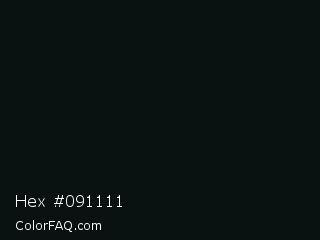 Hex #091111 Color is a almost black cyan color and the nearest color is Woodsmoke #0c0d0f. Hex code #091111 and RGB value is rgb(9,17,17). In RGB color space, this color is composed of 4% red, 7% green, 7% blue, In CMYK color space, this color is composed of 47% cyan, 0% magenta, 0% yellow , 93% black , In HSL color space, this color has a hue angle of 180° , 31% saturation and 5% lightness.