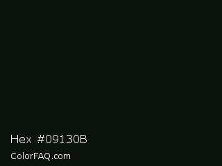 Hex #09130b Color is a almost black green color and the nearest color is Gordons Green #0b1107. Hex code #09130b and RGB value is rgb(9,19,11). In RGB color space, this color is composed of 4% red, 7% green, 4% blue, In CMYK color space, this color is composed of 53% cyan, 0% magenta, 42% yellow , 93% black , In HSL color space, this color has a hue angle of 132° , 36% saturation and 5% lightness.