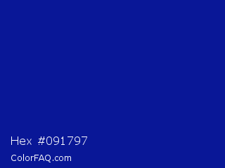 Hex #091797 Color is a normal blue color and the nearest color is Indigo Dye #091f92. Hex code #091797 and RGB value is rgb(9,23,151). In RGB color space, this color is composed of 4% red, 9% green, 59% blue, In CMYK color space, this color is composed of 94% cyan, 85% magenta, 0% yellow , 41% black , In HSL color space, this color has a hue angle of 234° , 89% saturation and 31% lightness.