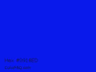 Hex #0918ed Color is a normal blue color and the nearest color is Bluebonnet #1c1cf0. Hex code #0918ed and RGB value is rgb(9,24,237). In RGB color space, this color is composed of 4% red, 9% green, 93% blue, In CMYK color space, this color is composed of 96% cyan, 90% magenta, 0% yellow , 7% black , In HSL color space, this color has a hue angle of 236° , 93% saturation and 48% lightness.