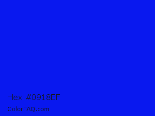 Hex #0918ef Color is a normal blue color and the nearest color is Bluebonnet #1c1cf0. Hex code #0918ef and RGB value is rgb(9,24,239). In RGB color space, this color is composed of 4% red, 9% green, 94% blue, In CMYK color space, this color is composed of 96% cyan, 90% magenta, 0% yellow , 6% black , In HSL color space, this color has a hue angle of 236° , 93% saturation and 49% lightness.
