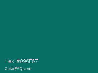 Hex #096f67 Color is a dark cyan color and the nearest color is Mosque #036a6e. Hex code #096f67 and RGB value is rgb(9,111,103). In RGB color space, this color is composed of 4% red, 44% green, 40% blue, In CMYK color space, this color is composed of 92% cyan, 0% magenta, 7% yellow , 56% black , In HSL color space, this color has a hue angle of 175° , 85% saturation and 24% lightness.