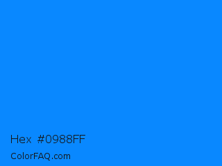 Hex #0988ff Color is a normal blue color and the nearest color is Azure Radiance #007fff. Hex code #0988ff and RGB value is rgb(9,136,255). In RGB color space, this color is composed of 4% red, 53% green, 100% blue, In CMYK color space, this color is composed of 96% cyan, 47% magenta, 0% yellow , 0% black , In HSL color space, this color has a hue angle of 209° , 100% saturation and 52% lightness.
