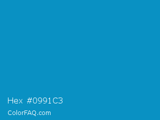 Hex #0991c3 Color is a normal blue color and the nearest color is Blue Green #0d98ba. Hex code #0991c3 and RGB value is rgb(9,145,195). In RGB color space, this color is composed of 4% red, 57% green, 76% blue, In CMYK color space, this color is composed of 95% cyan, 26% magenta, 0% yellow , 24% black , In HSL color space, this color has a hue angle of 196° , 91% saturation and 40% lightness.