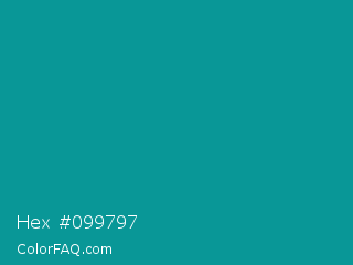 Hex #099797 Color is a normal cyan color and the nearest color is Viridian Green #009698. Hex code #099797 and RGB value is rgb(9,151,151). In RGB color space, this color is composed of 4% red, 59% green, 59% blue, In CMYK color space, this color is composed of 94% cyan, 0% magenta, 0% yellow , 41% black , In HSL color space, this color has a hue angle of 180° , 89% saturation and 31% lightness.