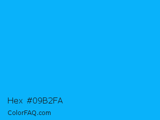 Hex #09b2fa Color is a normal blue color and the nearest color is Blue Bolt #00b9fb. Hex code #09b2fa and RGB value is rgb(9,178,250). In RGB color space, this color is composed of 4% red, 70% green, 98% blue, In CMYK color space, this color is composed of 96% cyan, 29% magenta, 0% yellow , 2% black , In HSL color space, this color has a hue angle of 198° , 96% saturation and 51% lightness.