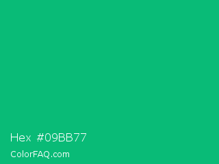 Hex #09bb77 Color is a normal green color and the nearest color is Green Munsell #00a877. Hex code #09bb77 and RGB value is rgb(9,187,119). In RGB color space, this color is composed of 4% red, 73% green, 47% blue, In CMYK color space, this color is composed of 95% cyan, 0% magenta, 36% yellow , 27% black , In HSL color space, this color has a hue angle of 157° , 91% saturation and 38% lightness.